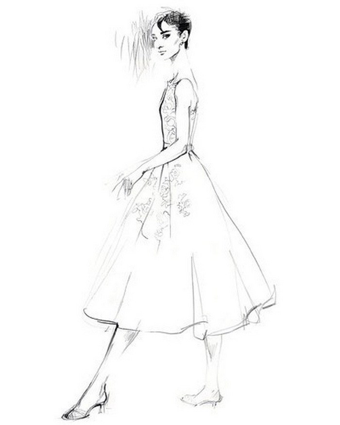Затем очередь одежды. Придав форму верхней части — лифу, рукавам и перчаткам – можно приступать к низу. Завершающим этапом наброска станет проработка складок, оборок нижней юбки и туфелек. После чего готовое изображение можно заполнить цветом.