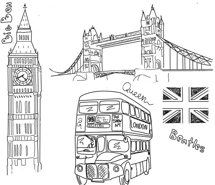set von london, großbritannien und britischer kultur kritzeleien, cartoon-cliparts — drawing of the great britain flag stock-grafiken, -clipart, -cartoons und -symbole mit bussen und taxis — рисунок флага великобритании сток-график, -клипарт, -мультфильмы и -символLondon und Großbritannien nahtloses Muster mit Bussen und Taxis
