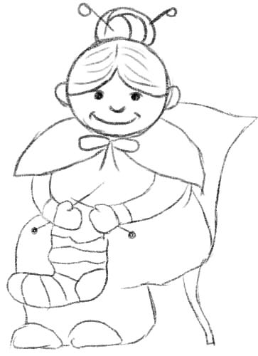 7. Дорисовываем стул, на котором сидит бабушка и вяжет что-то из пряжи.