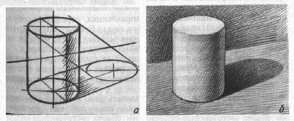 Построив каркас цилиндра, в котором верно изображены в перспективе оба основания (нижнее — немного шире, как это смотрелось в натуре), сравните изображение с натурой и переходите к моделировке формы тоном. Если в тоновом рисунке куба была определенная сложность, вызванная передачей пропорциональных натур светотеневых отношений, то в тональной характеристике цилиндра нужны дополнительные усилия, чтобы понять степень распределения градаций света и тени по его специфической поверхности.