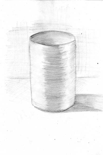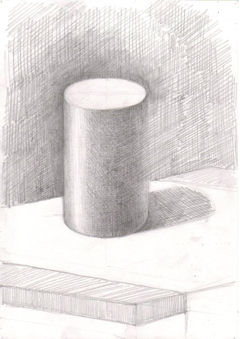 - Третий этап. Нанесение светотени для выявления объема. Штрихи подчеркивают форму цилиндра. Обобщение и соблюдение верных тональных отношений в процессе завершения работы для достижения законченности рисунка.