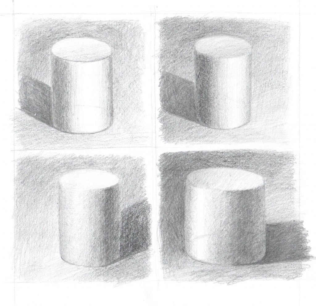 Цилиндр будет состоять из 3 градуированных значений , которые составляют изогнутую сторону стенки цилиндра, и одного четного значения для верхней части цилиндра. Полезно попрактиковаться в рисовании цилиндра с полным диапазоном значений.