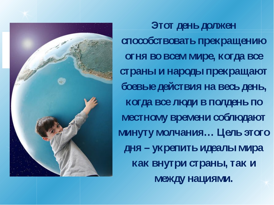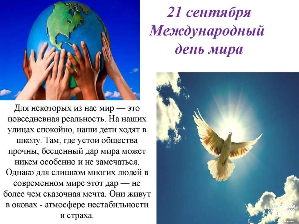21 сентября мы будем отмечать Международный день мира, также известный как День мира. День мира был начат в 1981 году единогласной резолюцией Организации Объединенных Наций как стандартная дата для всех нас на планете, чтобы задуматься и подтвердить свою приверженность миру.