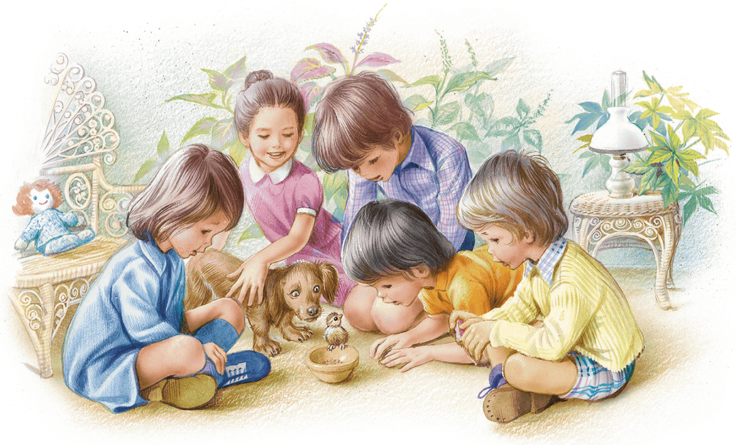 А вот еще картинка с первым и вторым планом — такие картинки с несколькими персонажами отлично подходят для подробных занятий с детьми — развивающими их технику речи и творческое мышление. Ведь можно не просто описывать, что видишь на картинке в данный момент — а придумать сочинить отношения между детьми, о чем они беседуют, во что планируют поиграть дальше.