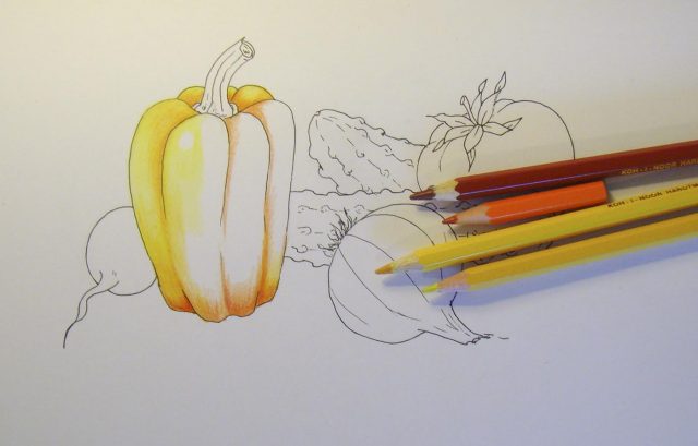 Начнем из перца. Раскрась его желтым карандашом, минуя зону блика. Места впадин и неровностей закрась оранжевым и коричневым карандашами.