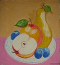 Воспитатель: Вот сколько замечательных блюд можно приготовить из фруктов. Я вам сегодня предлагаю нарисовать натюрморт из яблока, груши и сливы в вазе. Смотрели мультфильм «Маша и Медведь», где Медведь рисовал яблоки и груши в золотых амфорах возле бочки мёда. Это и есть натюрморт. Это могут быть фрукты, овощи, цветы, рыба – всё, что мы собираем, срезаем, ловим – это всё натюрморт. Вот посмотрите несколько натюрмортов.