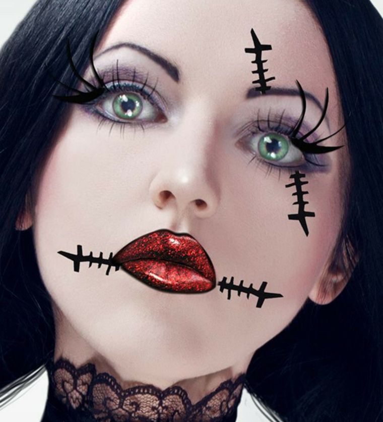 Кукла-убийцаТебе потребуется: светлый тональный крем, серые или коричневые тени, накладные ресницы, жидкая подводка, карандаш для бровей и красная помада. Для полноты образа проработай коленки и локти, карандашом обводя суставы.