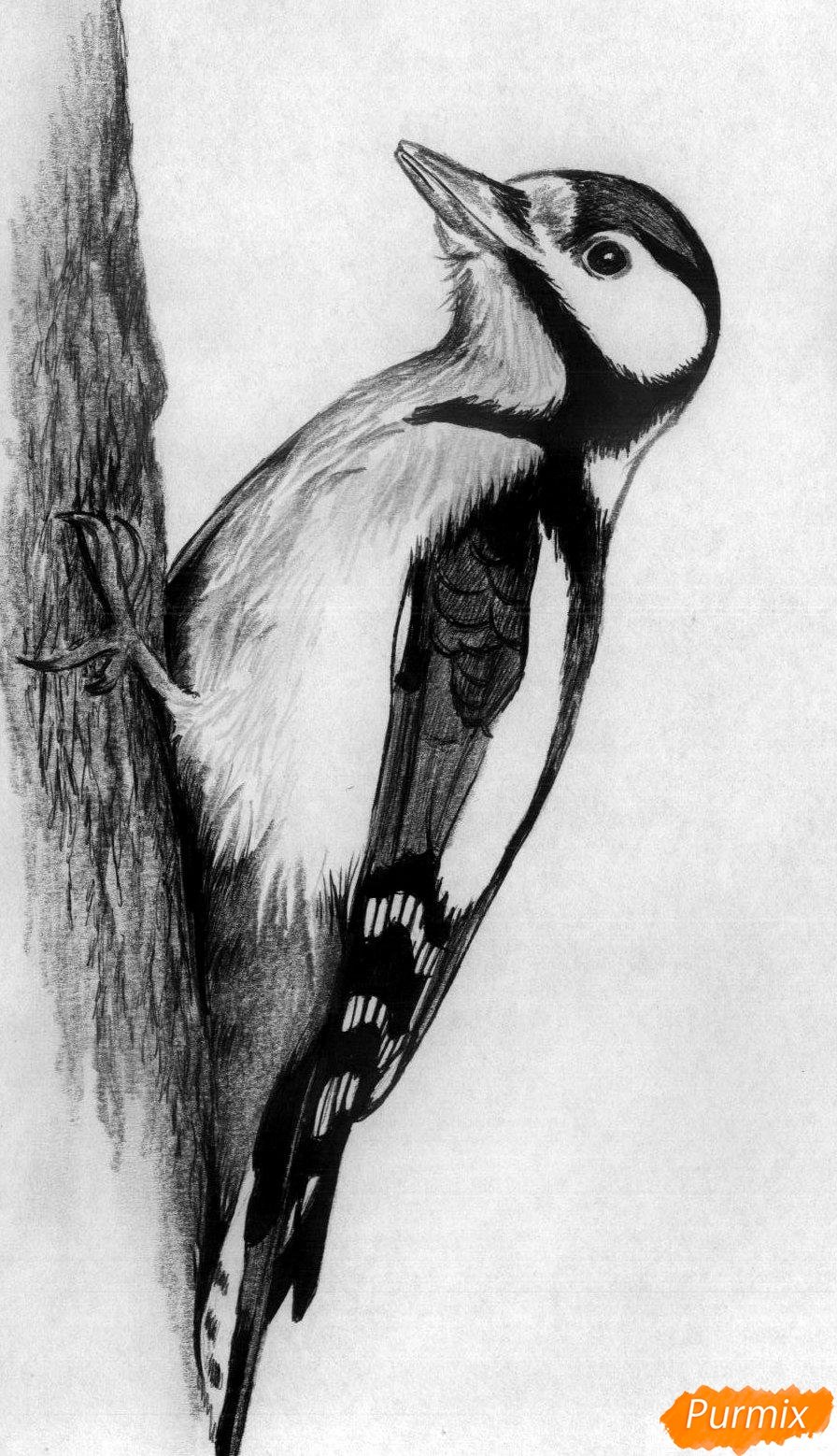 Как только это будет закончено, вы можете набросать форму клюва, а затем — под клювом. ШАГ 3. Теперь нарисуйте форму птиц на спине, а затем начните рисовать полосы по бокам лица, как вы видите здесь. Проведите линию посередине клюва, чтобы отделить верхний и нижний клюв. ШАГ 4.Продолжайте рисовать тело дятла, которое включает шею, грудь и живот. Как только это будет сделано, вы можете начать набрасывать крыло и не забудьте добавить детали линий перьев, а также нарисовать подкладку для дерева. ШАГ 5. Нарисуйте больше дерева, как вы видите, а затем нарисуйте отверстие и раскрасьте его. Детализируйте кору дерева, как это показано, и переходите к шагу шесть. ШАГ 6.Для вашего последнего шага рисования все, что вам нужно сделать, это вытянуть остальную часть крыла дятла, а затем хвост. Обязательно покажите детальную подкладку для перьев, как показано здесь. Сотрите все направляющие и формы, и все готово! ШАГ 7. Вот как будет выглядеть готовый рисунок, когда вы закончите. Надеюсь, вам понравился этот урок о том, как нарисовать дятла, присоединяйтесь ко мне снова, чтобы получить больше удовольствия от рисования.