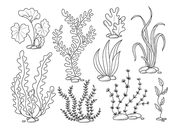 koralle. вектор korallenriff ozean tier unterwasserleben doodle linie isolierte illustration. — красные водоросли сток-график, -клипарт, -мультфильмы и -символ Koralle.