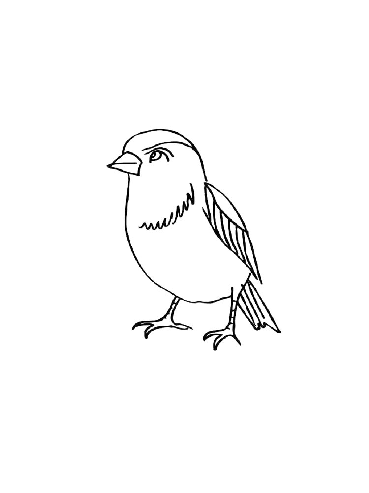 Плавной линией соединяем голову с телом так, чтобы голова казалась немного торчащей вверх. Чуть ниже соединения круга и овала дадим линии небольшой выпуклости — это будет грудка птицы. Внизу овала, очень близко к хвосту, намечаем ступни воробья. Основание хвоста треугольника продолжается прямой линией.
