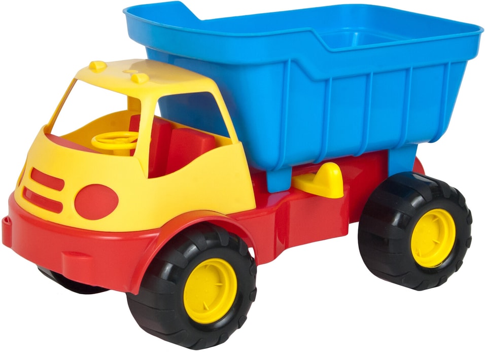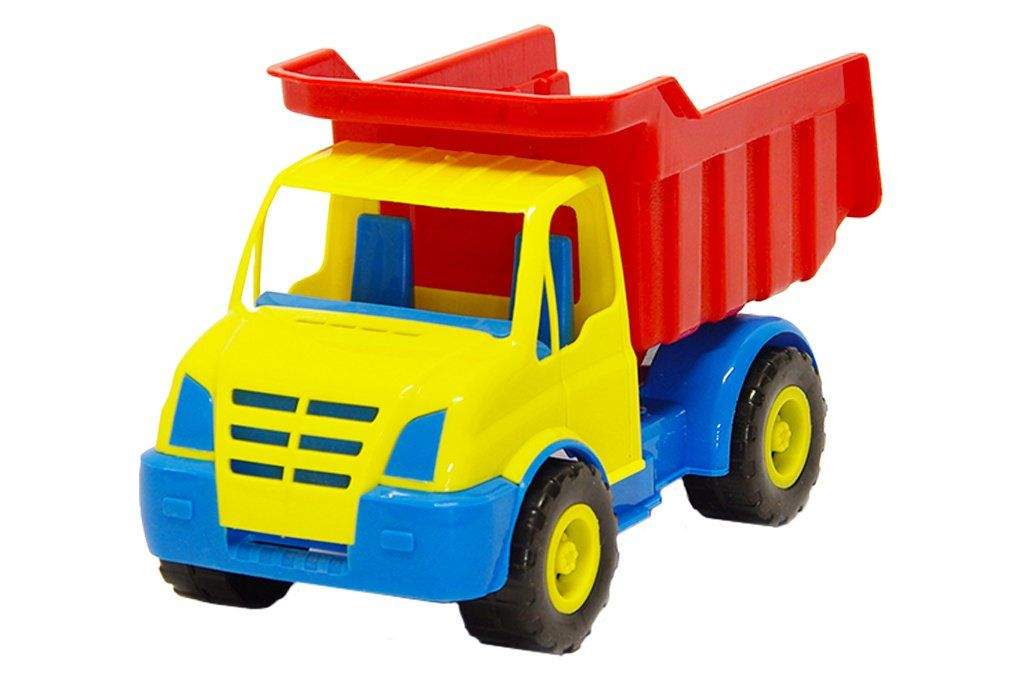 Kleiner Junge Draußen im Garten, der auf einem spielzeug-muldenkipper spielt und lächelt und spaß hat