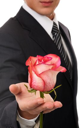 Мальчик собирается подарить девочке цветы.