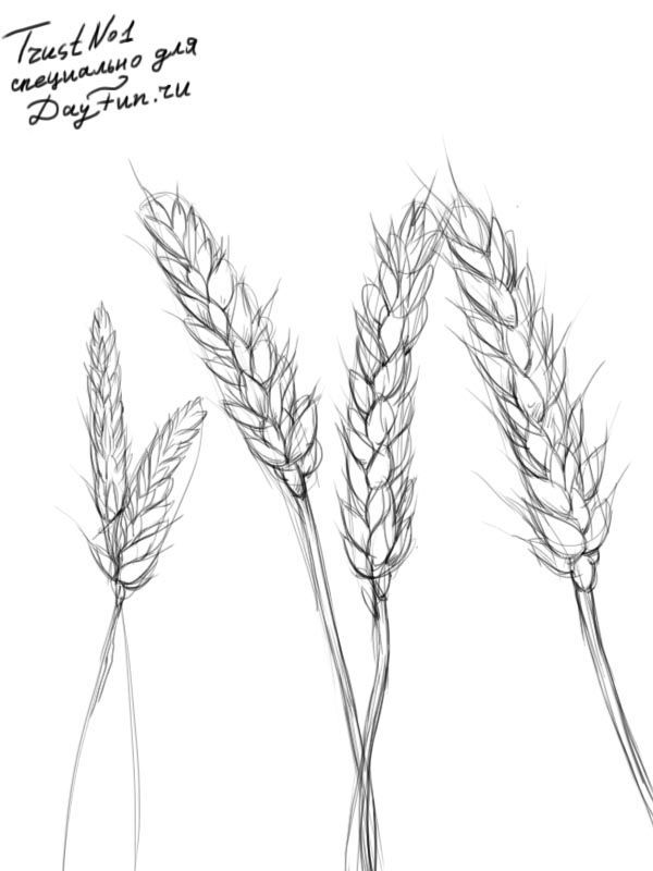 Воспитатель: Молодцы, ребята, присаживайтесь на свои места. Посмотрите на картинку, с изображением колоска, из чего он состоит? (стебель, зёрна и усики). Сначала мы нарисуем стебель, потом начнём рисовать семена они у нас какой формы ребята? (овальной). Правильно, потом мы прорисуем усики тоненькой кисточкой аккуратно между зёрнышек. Посмотрите как красиво получается (воспитатель показывает как получилось у него), а рядом мы нарисуем ещё один колосок.