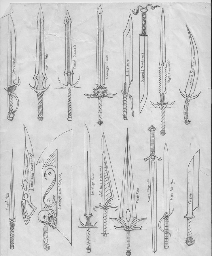 Eine Reihe von Fantasy-Schwertern, die in einem Oldschool-Tintenstil gerendert wurden. EnthΓ€lt Dolche, ein japanisches Katana, einen schottischen Claymore, Scimitars, einen Gladius ΠΈ andere verschiedene Schwerter.