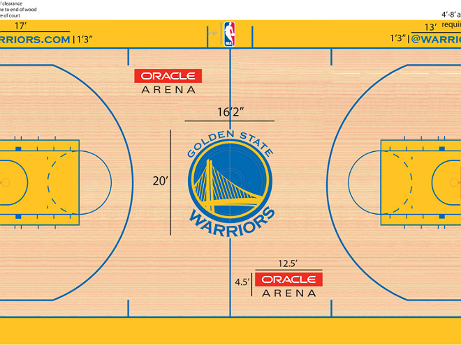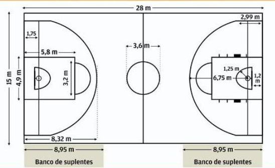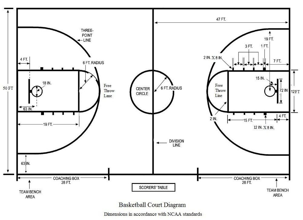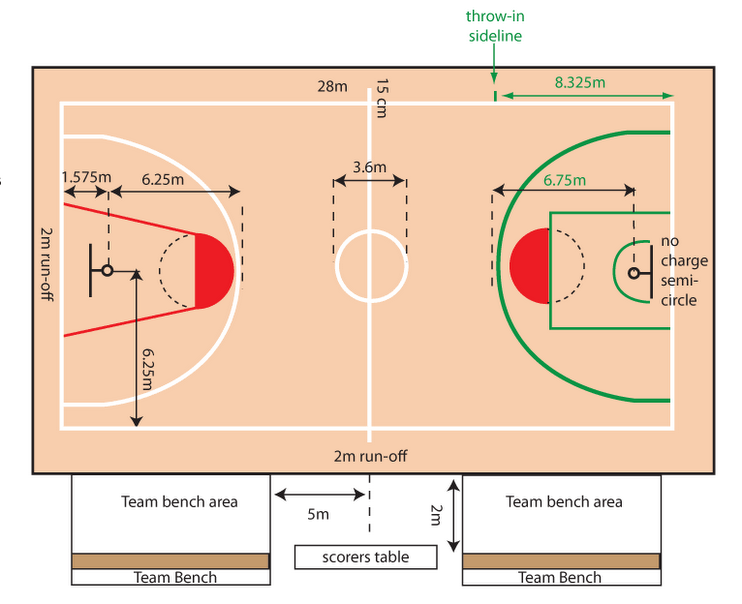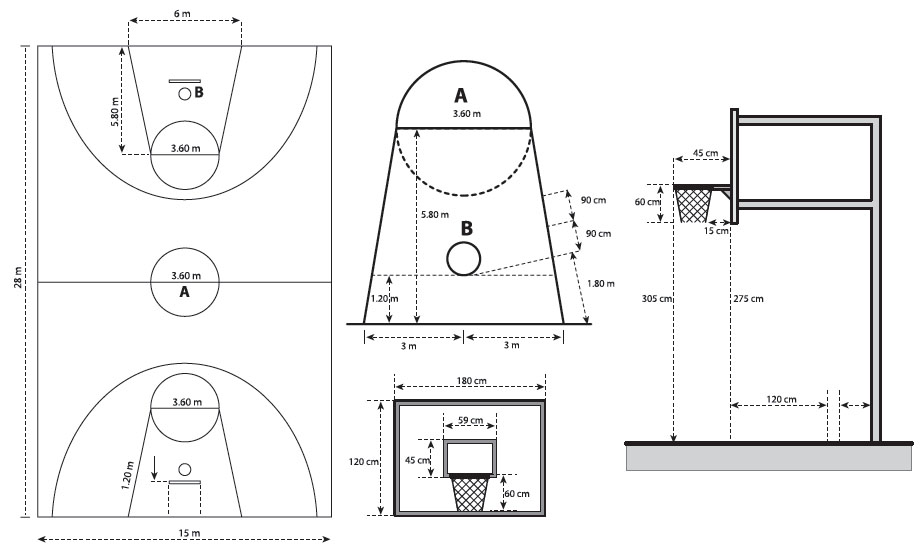 Требования к разметке баскетбольного поля утверждены стандартом ФИБА. Площадка должна быть плоской с твёрдым покрытием, не иметь изгибов, трещин и других препятствий. Принятые размеры поля: длина 28 м и ширина 16 м. По стандартам NBA поле незначительно больше: 28.7 м (94’ фута) в длину и 15.3 м (50’ футов) в ширину.