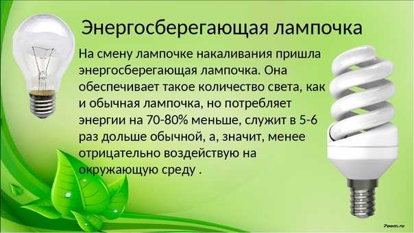Замена одной лампы накаливания на компактную люминесцентную лампу предотвратит выброс в атмосферу полтонны CO2 в течение всего срока службы лампы. Если бы все в США использовали энергосберегающее освещение, мы могли бы выйти на пенсию 90 электростанций среднего размера. Экономия электроэнергии снижает выбросы CO2, оксида серы и высокоактивных ядерных отходов.