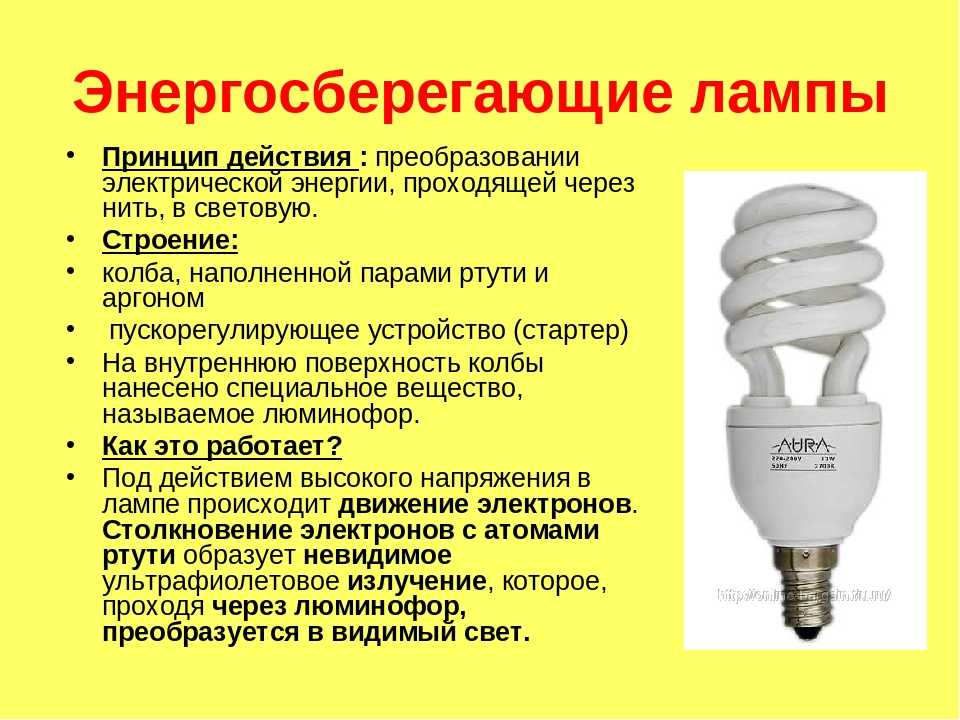 Энергосберегающие лампы состоят из колбы, наполненной парами ртути и аргоном, и пускорегулирующего устройства (стартера). На внутреннюю поверхность колбы нанесено специальное вещество, называемое люминофор. Под действием высокого напряжения в лампе происходит движение электронов. Столкновение электронов с атомами ртути образует невидимое ультрафиолетовое излучение, которое, проходя через люминофор, преобразуется в видимый свет.
