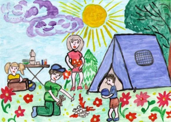 Мы будем двигаться по течению каменистой речки, нас станет повсюду преследовать прохладный запах осоки и речного песка. А с неба будет палить жаркое июльское солнце. Задевая при ходьбе полевые цветы, мы нечаянно будем тревожить, собирающих нектар пчел. Мы идем весело с шутками и весельем. Когда солнце коснется горизонта, всей компанией мы заберемся на самый высокий холм, и перед нами откроется вид на многие километры, а в горизонте будет утопать остывающее летнее солнце. Прямо на холме будет поставлена палатка, и разведен костер, сидя родом с другом, мы до наступления ночи, устремим взгляд на тающий закат. А после приготовим еду, и начнем рассказывать друг другу страшные истории до самой полночи.