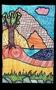 - Следующий этап – это повторное накладывание того же рисунка, только теперь на черный просохший фон. Нужно обвести рисунок шариковой ручкой. В процессе работы изображение будет передавлено на мягкую восковую поверхность. Убираем листик с обведенным рисунком. В результате на черном фоне появится проступившее изображение. Все должно совпасть и по цвету, и по рисунку. Теперь осталось доцарапать, доскоблить или подправить, нанести еще штрихи, где это нужно. Если же необходимости в предварительном рисунке изначально не было, то можно процарапывать сразу по просохшему черному фону то, что хочется, что задумывалось. Главное, определить, какие части рисунка должны остаться черного цвета.