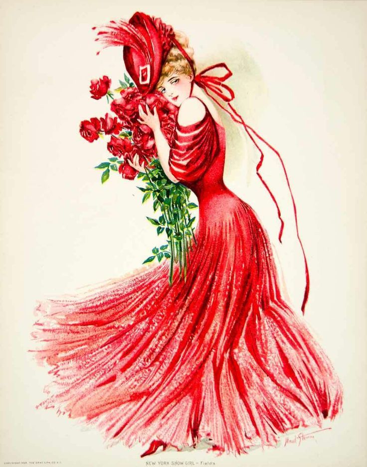 Mädchen in einem roten Kleid mit einer Rose in der Hand.